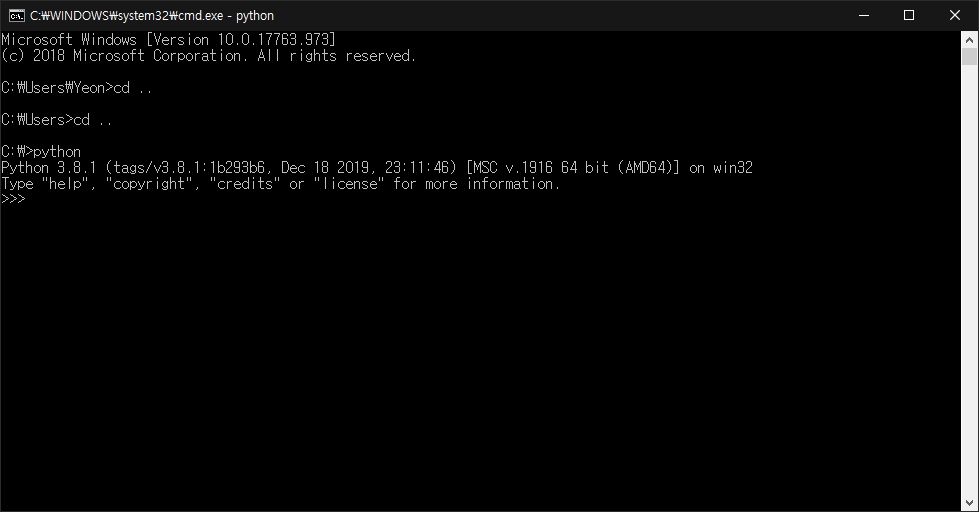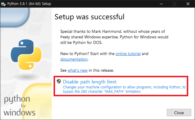 파이썬 설치가 완료되었습니다.