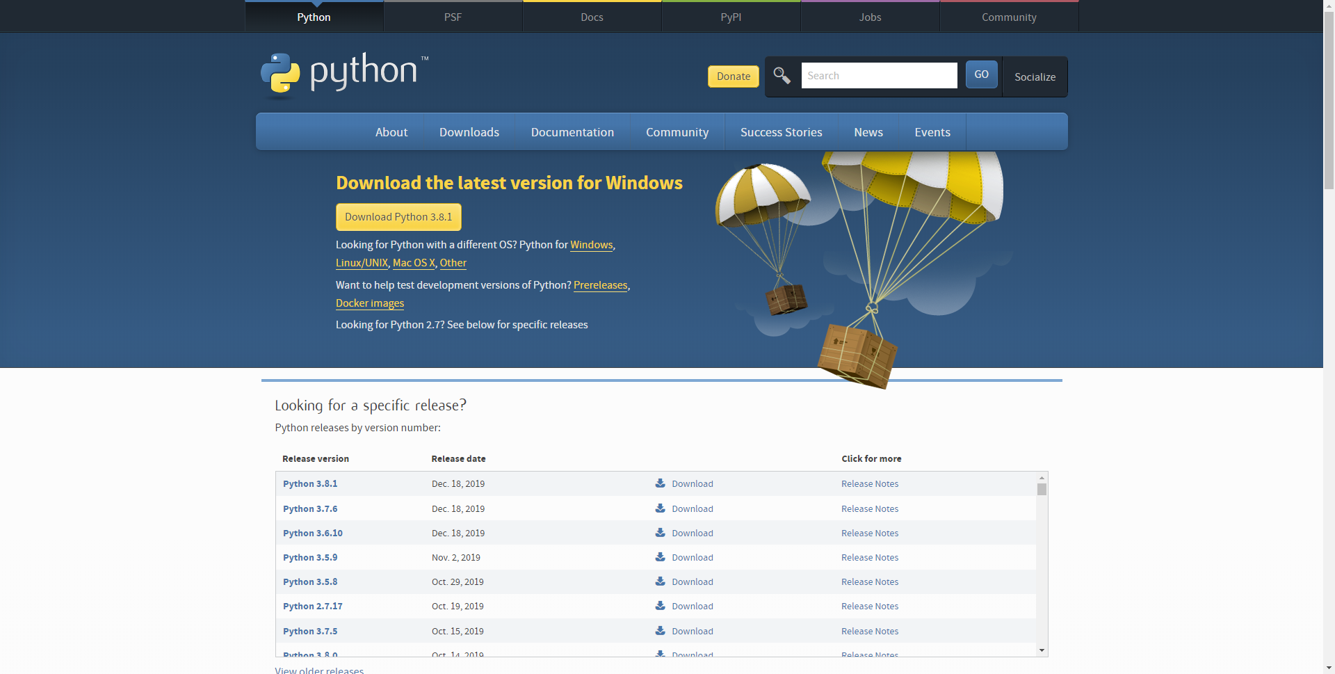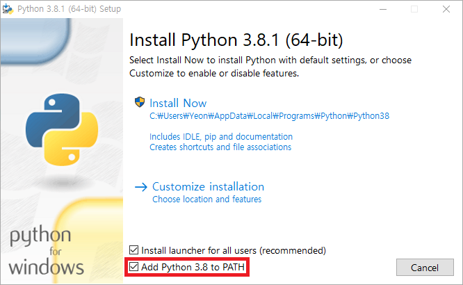 파이썬 홈페이지에서 최신 버전(3.8.1)을 다운로드하여 설치합니다.
