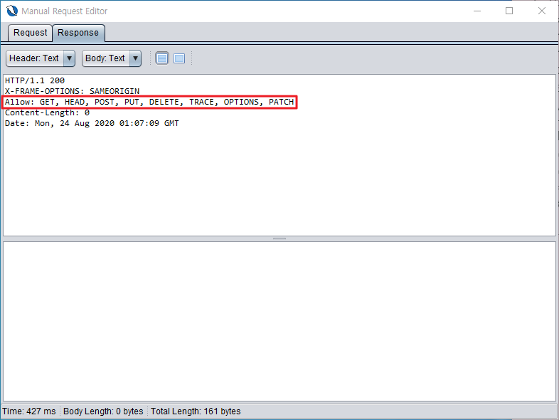 이번 실습에선 HTTP Method를 보기 위하여 최초 GET으로 되어있던 부분을 OPTIONS로 변경했습니다.